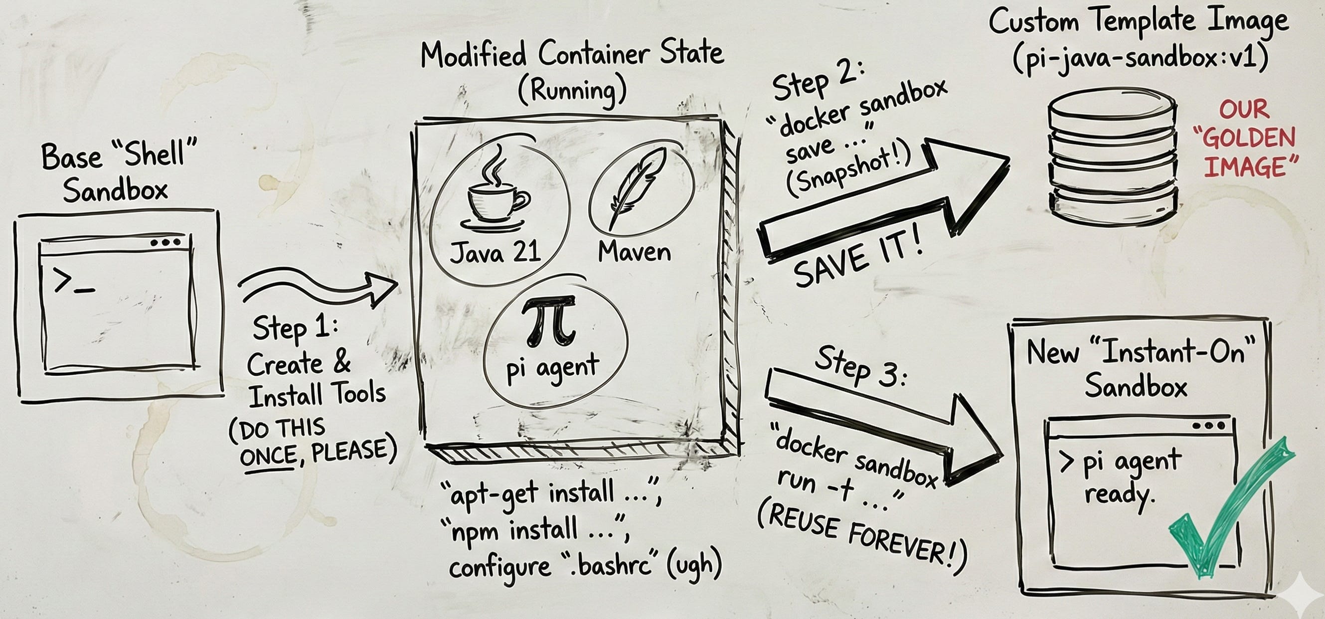 Turns out Docker Sandboxes has a save command. You set up a sandbox once, snapshot it, and every new sandbox starts from that checkpoint. No more re-installing Java for the fourth time today.