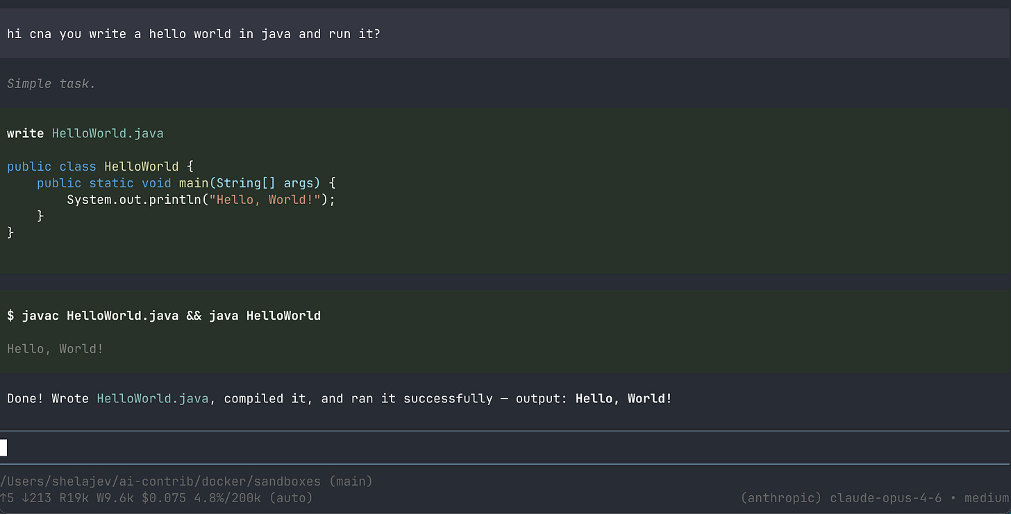 That’s it. The sandbox boots, bash starts, .bashrc fires, and you’re in pi with Java and Maven ready to go. Ask it to write a Spring Boot app, run mvn test, whatever you need.